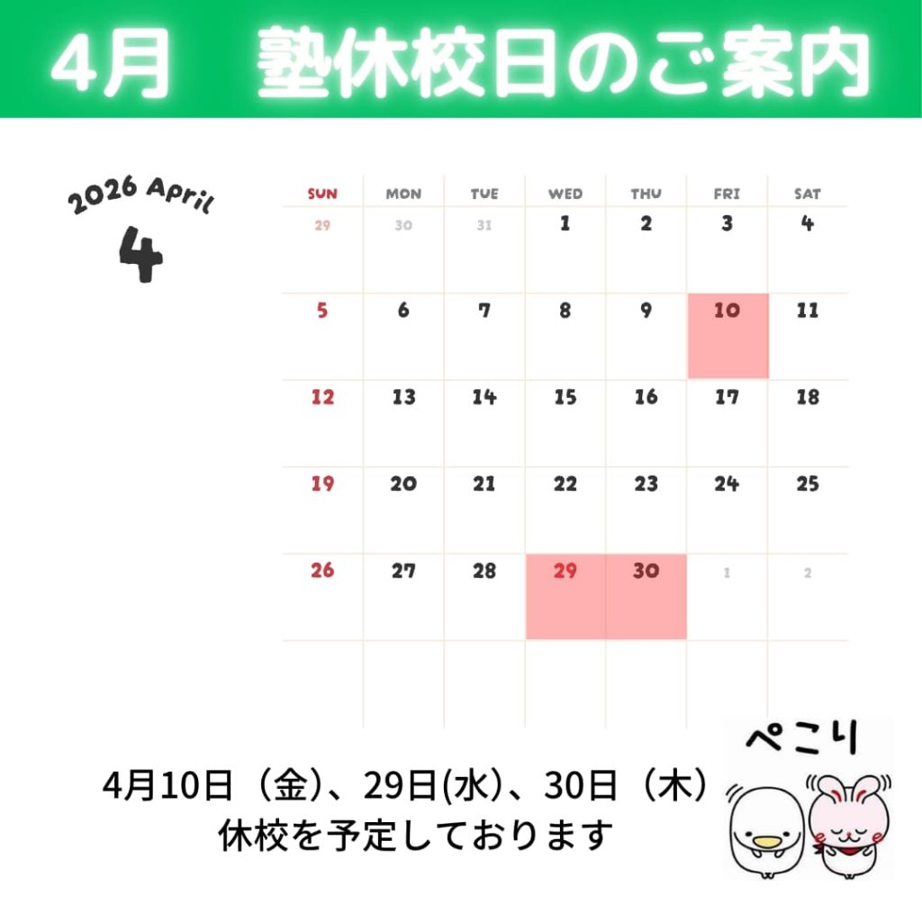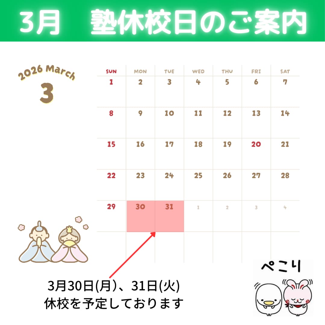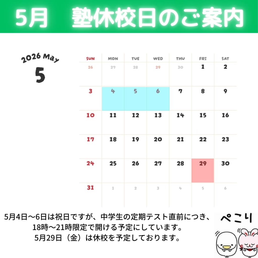 塾カレンダー(2026年2月23日更新) いつも「まなびや」の運営にご理解とご協力をいただき、誠にありがとうございます。当塾では通常、月4週制を採用しており、月に5回ある曜日の5週目を「休塾日」として設定しておりますが、中学生の定期テスト期間などにあわせて一部日程を調整させていただいております。以下、年末年始の休塾日をご案内いたします。目次3月の休校日4月の休校日5月の休校日3月の休校日4月の休校日5月の休校日