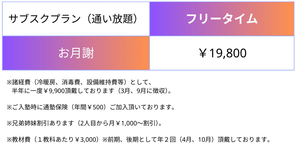- 月曜日から金曜日の開校時間中(14:30~21:00)、ご予約不要で、好きなだけ通塾・学習していただけます。